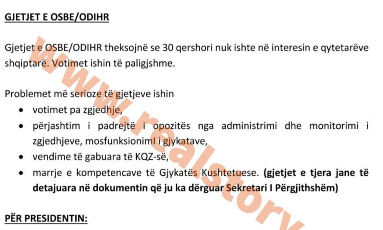 Dokumenti ekskluziv i gjetur nga realstory, u jep këshilla anëtarëve të kryesisë dhe ish deputetëve se çfarë qëndrimesh duhet të mbajnë në lidhje me zgjedhjet duke iu referuar gjetjeve të OSBE/ODIHR që “theksojnë se 30 qershori nuk ishte në interesin e qytetarëve shqiptarë dhe votimet ishin të paligjshme”.