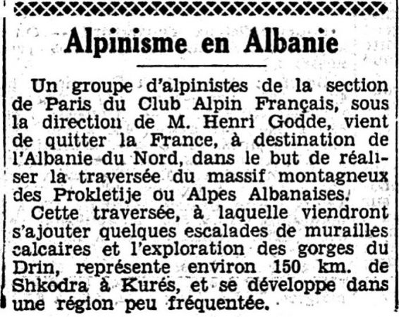 “Një grup alpinistësh të Klubit Alpin Francez të Parisit, nën drejtimin e Z. Henri Godde, sapo është larguar nga Franca, në drejtim të Shqipërisë së Veriut, me qëllim kalimin e vargmalit të Prokletijeve (Bjeshkëve) ose Alpeve Shqiptare.