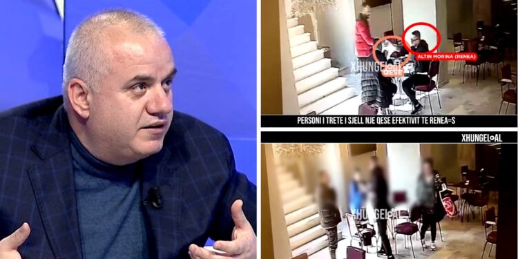 Ky regjistrim është kamer lokali është bërë vetëm 1 orë para se të arrestohej. Kjo është në zonën e Tiranës së Re. Është në lokal. Ky është Altin Morina. Ky është kamarieri i lokalit. Ky është biznesmeni Gentian Gjoka. Ajo kutia e bardhë që la në tavolinë janë 113 mijë Euro. Këta të dy bisedojnë. Ia dorëzon. Pak më vonë në lokal kamarieri që ne e pamë aty del. Aty afër lokalit është një market dhe ka marrë një qese. Këtu ka ardhur djali i biznesmenit Gentian Gjoka dhe pastaj vjen edhe bashkëshortja. Kamarieri i solli qesen. Në atë qese u gjetën para. I merr paratë dhe i fut në qese. Këtu vjen më vonë bashkëshortja e biznesmenit edhe djali i tij. Largohen, çohet në këmbë ai dhe efektivi i RENEA-s. Futet në brendësi të lokalit, ja ku e ka qesen dhe pastaj largohet me qesen në dorë.