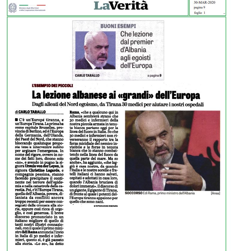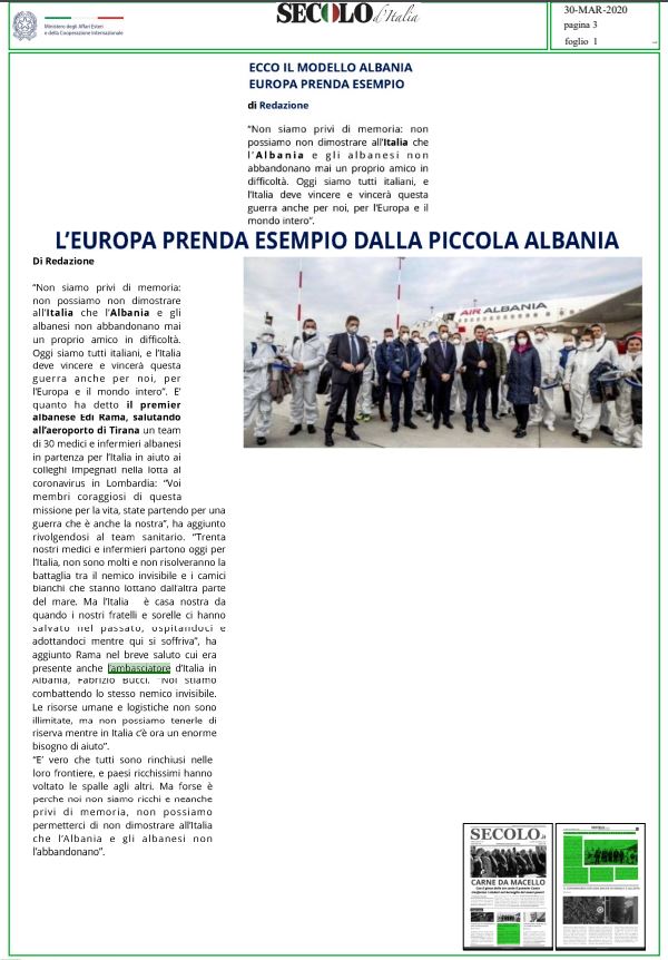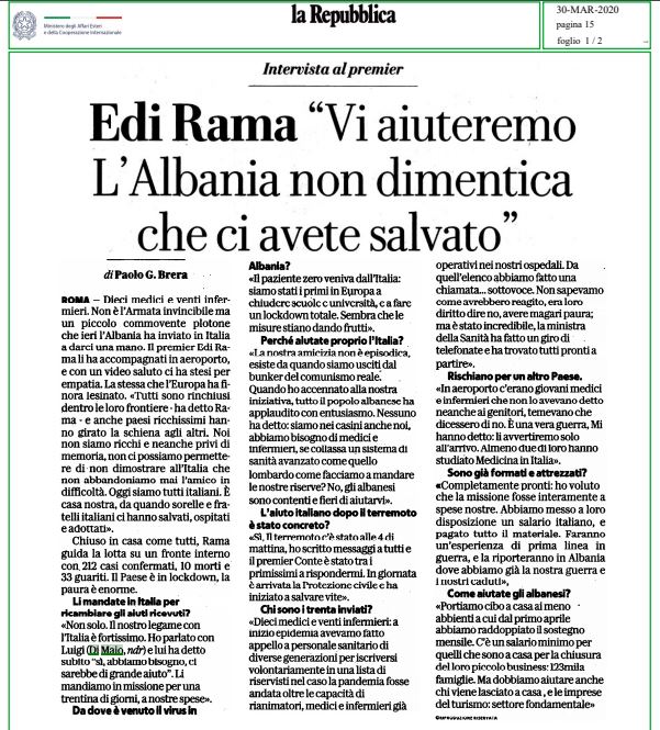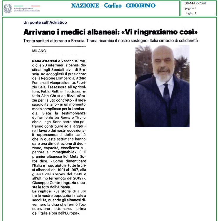 Mediat italiane i kanë kushtuar një hapësirë të zgjeruar vendimit të kryeministrit Edi Rama për të çuar në Itali 30 mjekë dhe infermjerë, të cilët do të shërbejnë krah kolegëve të tyre për t’i ardhur në ndihmë pacientëve të prekur nga Covid-19.