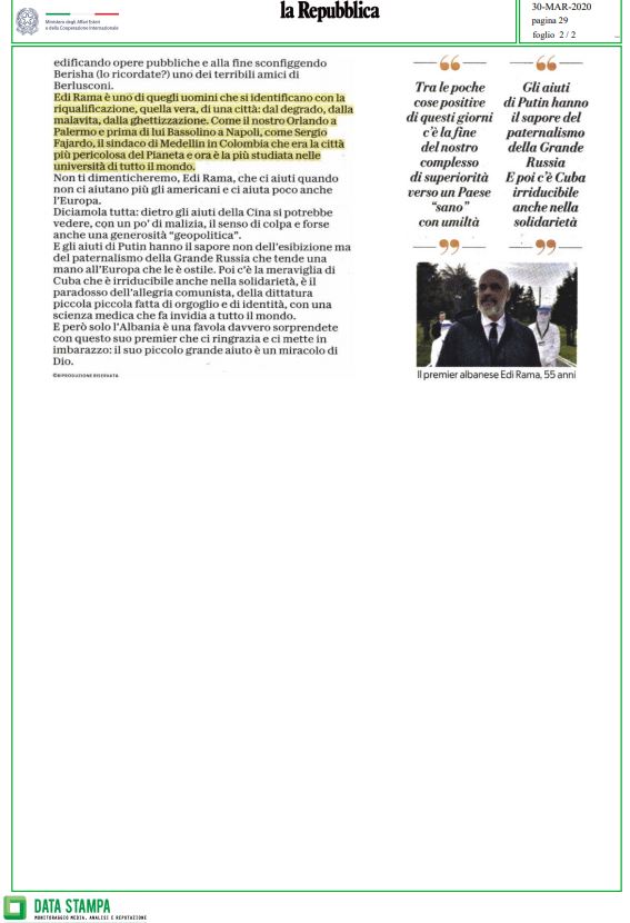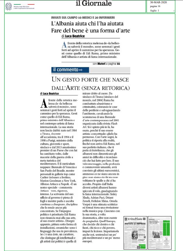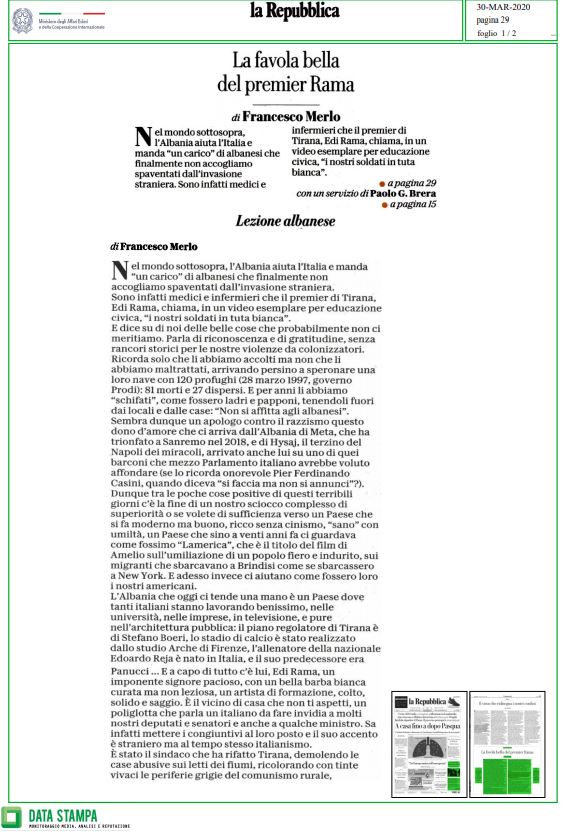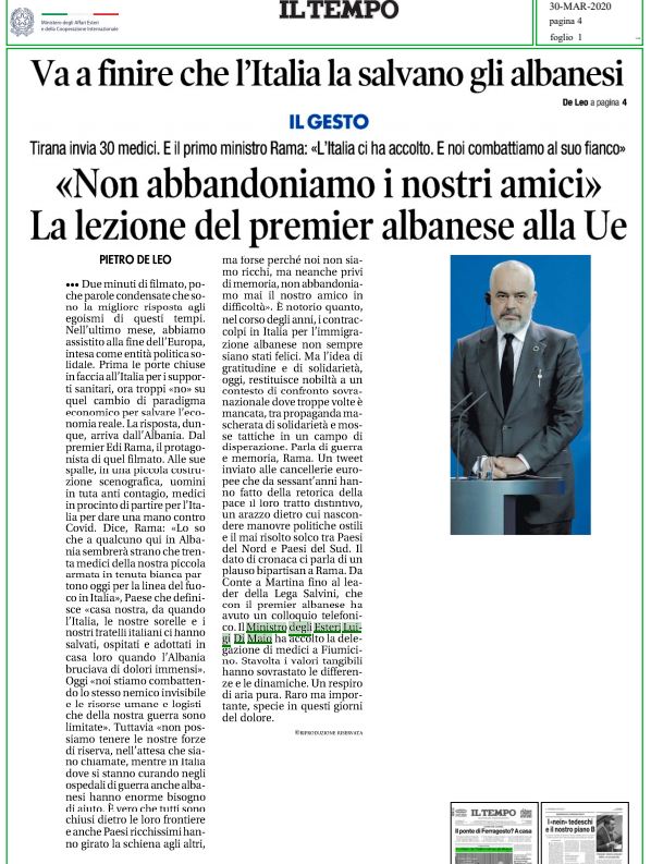 Prestigjozet “Il Tempo”, “la Reppublica”, “la Stampa”, “Secolo d’Italia”, “NAZIONE – Carlino – GIORNO”, janë disa nga dritaret të cilat kanë pasur në vëmendje deklaratat e kryeministrit Rama.
