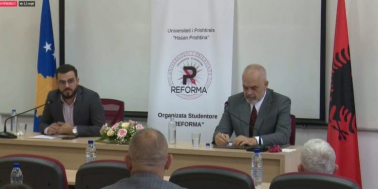 Kryeministri Edi Rama ka marrë pjesë gjatë vizitës në Kosovë në një bashkëbisedim me studentët e Marrëdhënieve Ndërkombëtare, në Universitetin e Prishtinës, i ftuar nga këta të fundit.