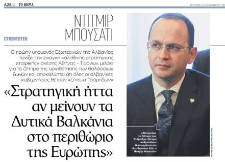 Intervistë e ish Ministrit të Punëve të Jashtme të Shqipërisë Ditmir Bushati për gazetën greke “To Vima”