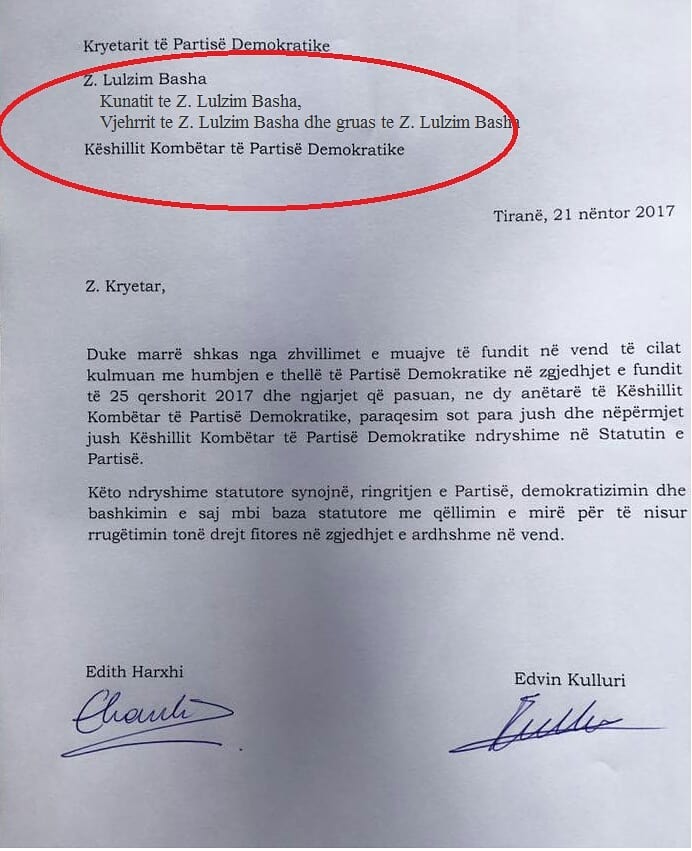 Deri këtu gjithçka duket normale, nga ana e dy anëtarëve të kësaj force Edit Harxhi dhe Edvin Kulluri. Por, ata ironizojnë teksa letrën e adresojnë edhe për bashkëshorten, kunatin dhe vjehrrin e Bashës.