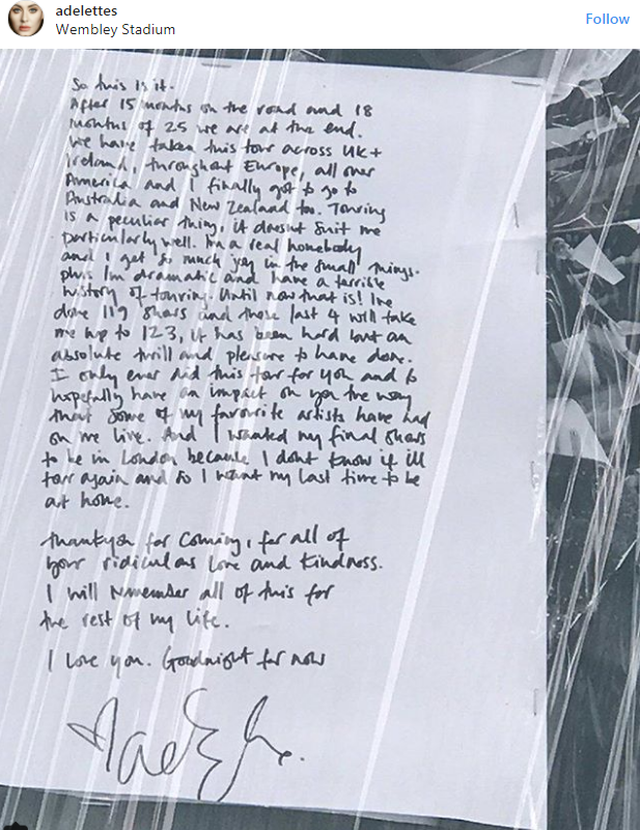 “Dua që spektakli im final të jetë në Londër, sepse nuk e di nëse do të bëjë më koncerte, prandaj dua që hera e fundit të jetë në shtëpi. Faleminderit që erdhët, për gjithë dashurinë dhe mirësinë tuaj. Do i kujtoj të gjitha këto për gjithë jetën. Ju dua. Natën e mirë”, shkruan Adele në këtë letër./a.ç