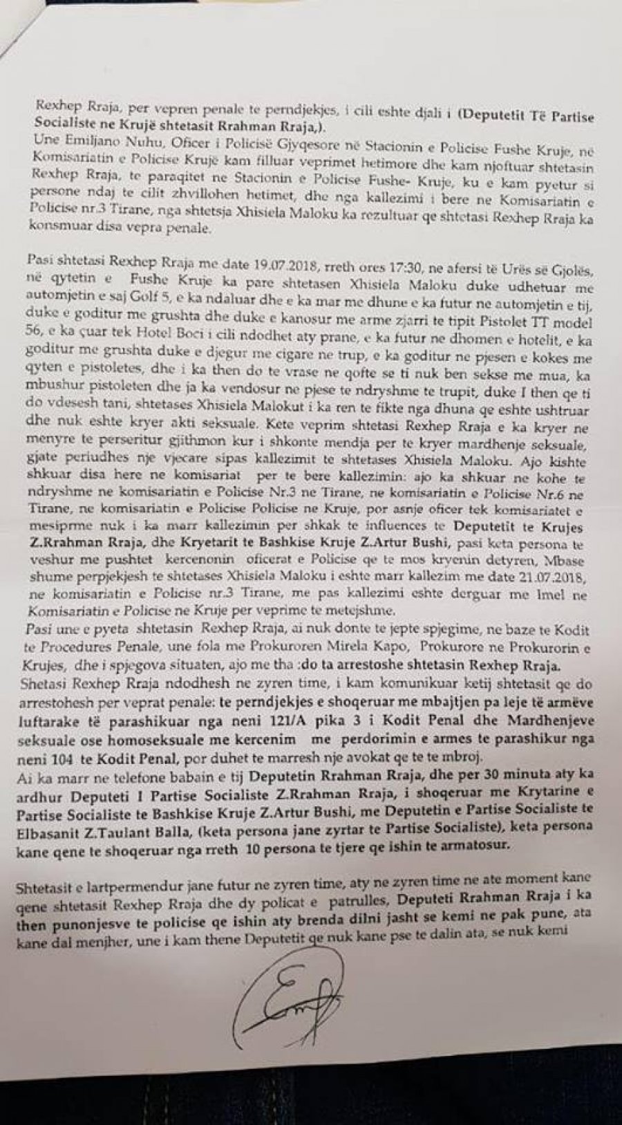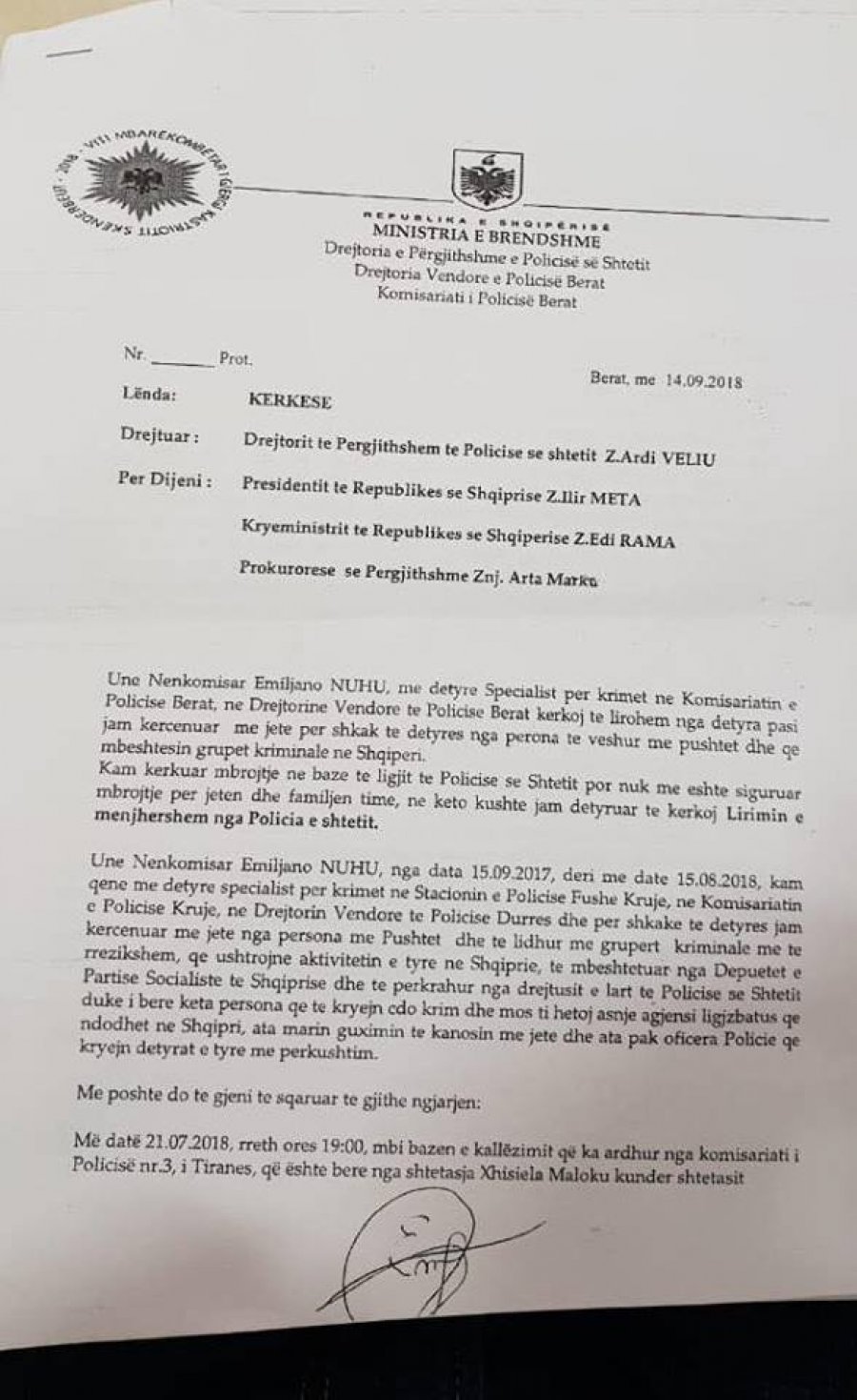 Në letrën e cila mban datën 14 shtator 2018, dhe që mban firmën e nënkomisar Emiljano Nuhu, ky i fundit kërkon lirimin nga detyra, pas kërcinimeve sipas tij, nga deputeti Rrahman Rraja, djali i të cilit akuzohej për përdhunim.