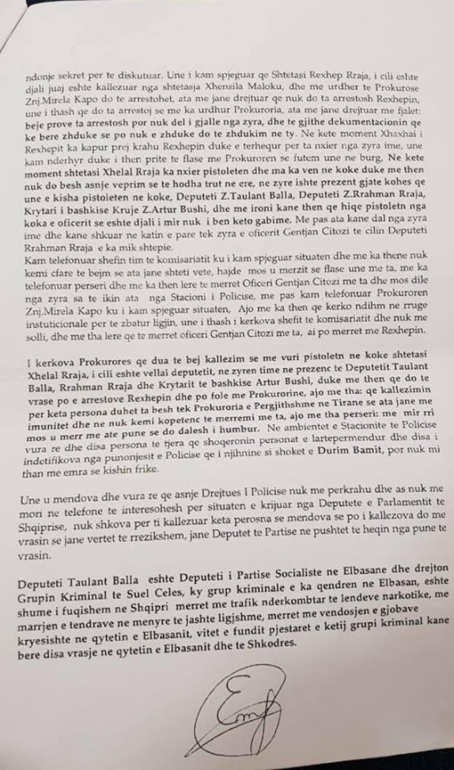 Kryetari i grupit të Partisë Socialiste Taulant Balla, në deklaratën për mediat bërë nga kryesia e Kuvendit, ka publikuar ndër të tjera letrën e dorëheqjes, që nënkomisar Emiljano Nuhu, u kishte drejtuar Drejtorit të Përgjithshëm të Policisë Ardi Veliu, dhe për dijeni presidentit Meta, kryeministrit Rama dhe kryeprokurores Marku.