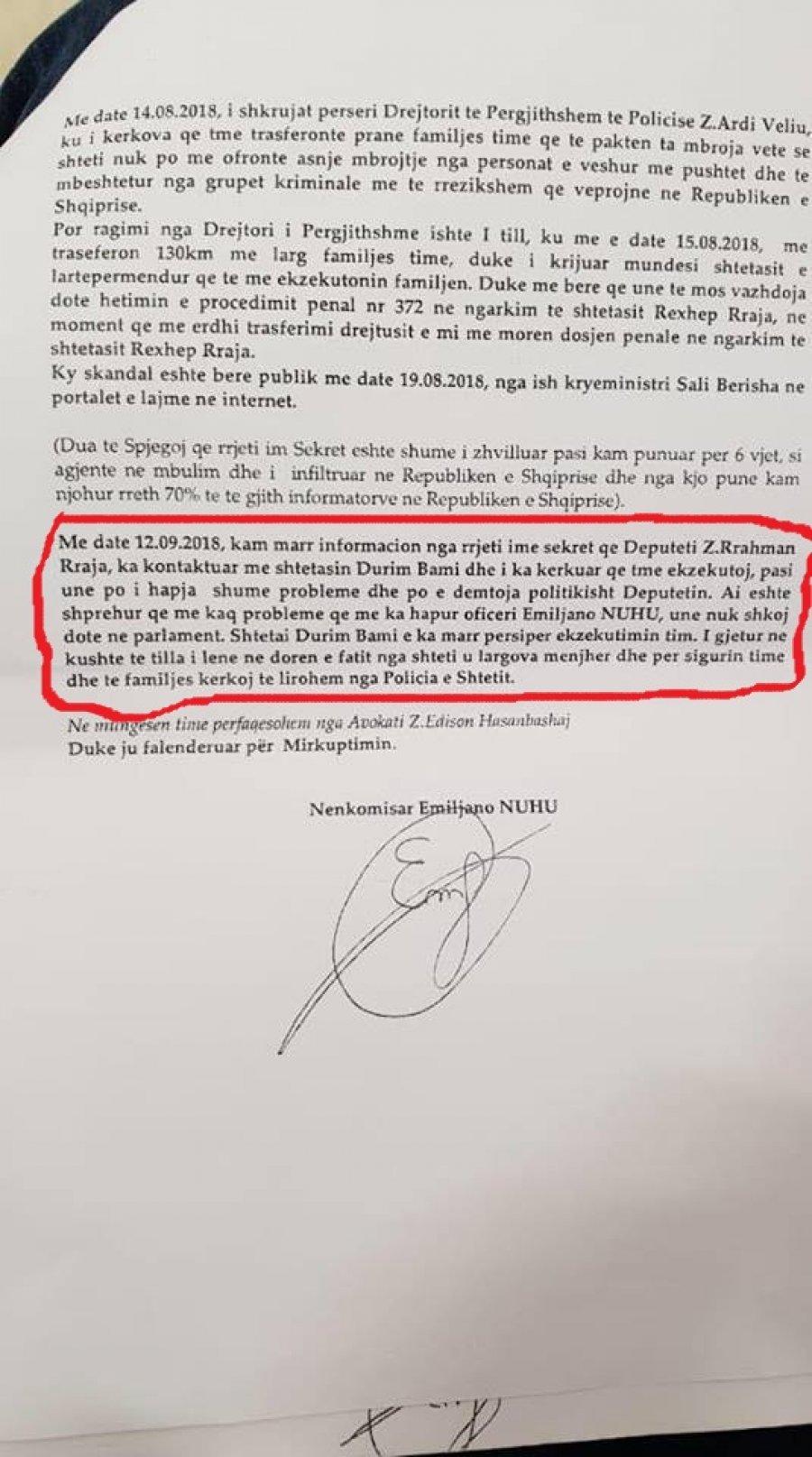 ‘Më datë 12.09.2018, kam marrë informacion nga rrjeti im sekret që deputeti Z.Rrahman Rraja, ka kontaktuar me shtetasin Durim Bami dhe i ka kërkuar që të më ekzekutojë, pasi unë po i hapja shumë probleme dhe po e dëmtoja politikisht deputetin. Ai është shprehur që me kaq probleme që më ka hapur oficeri Emiljani Nuhu, unë nuk shkoj dot në Parlament. Shtetasi Durim Bami e ka marrë përsipër ekzekutimin tim. I gjetur në kushte të tilla, i lënë në dorën e fatit nga shteti u largova menjëherë dhe për sigurinë time dhe të familjes kërkoj të lirohem nga Policia e Shtetit” shkruan Nuhu në letrën drejtuar e tij të dorëheqjës.
