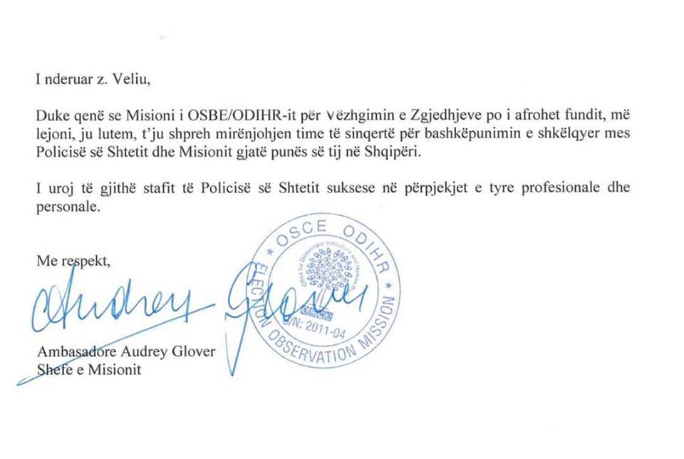 Shefja e misionit të OSBE/ODIHR në vendin tonë Audrey Glover, i ka nisur një letër drejtorit të policisë Ardi Veliu.