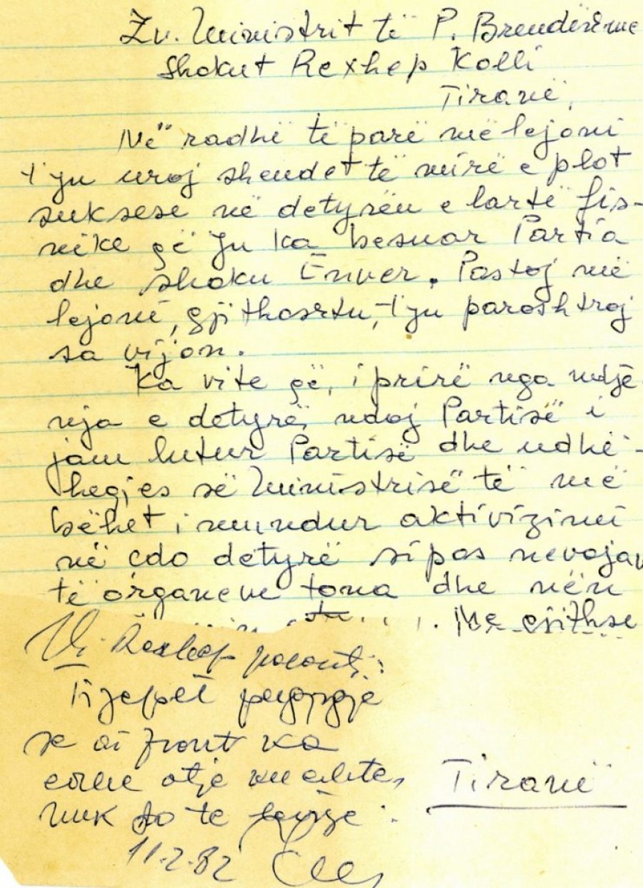 “Zëvendësministrit të Punëve të Brendshme, shokut Rexhep Kolli, Tiranë. Në radhë të parë më lejoni t’ju uroj shëndet të mirë e plot suksese në detyrën e lartë fisnike që ju ka besuar Partia dhe shoku Enver. Pastaj më lejoni gjithashtu t’ju parashtroj sa vijon: Ka vite që i prirë nga ndjenja e detyrës ndaj Partisë dhe udhëheqjes së Ministrisë, të më bëhet i mundur aktivizimi në çdo detyrë sipas nevojave të organeve tona dhe nën drejtimin e tyre. Megjithëse kjo lutja time u miratua, akoma deri tani aktivizimi nuk është bërë realitet për mungesë kushtesh objektive. Sikurse dihet mirë nga shokët e të tjerët, në kushtet që jam dhe në vendin ku banoj e punoj sot, nuk ekzistojnë kushtet e duhura që të afrohem ose të më afrohet ndonjë objekt me interes për organet tona që ta përpunoj e zbuloj si duhet. Prandaj prej kohësh më është thënë se do të më lëvizni për dikur gjetkë në Tiranë ose edhe në Durrës (ku kam dhe bijën time), por deri më sot, ky problem nuk është zgjidhur. Prandaj ju lutem shoku zëvendësministër, kushtojini pak kohë çështjes time dhe dispononi si të jetë më mirë që të mund të jap edhe unë kontributin tim modest në shërbim të Partisë time të dashur mbi çdo gjë në botë, siç ka qenë është e do të jetë deri në fund të jetës sime, aspirata dhe qëllimi themelor në punë e në jetë. Me respekt e dashuri të thellë, mbetem ushtari më i devotshëm i Partisë dhe i themelonjësit të dashur të Partisë e popullit e popullit tonë, shokut Enver Hoxha që të na rrojë sa malet tona dhe militanti më besnik e i bindur i organeve tona.