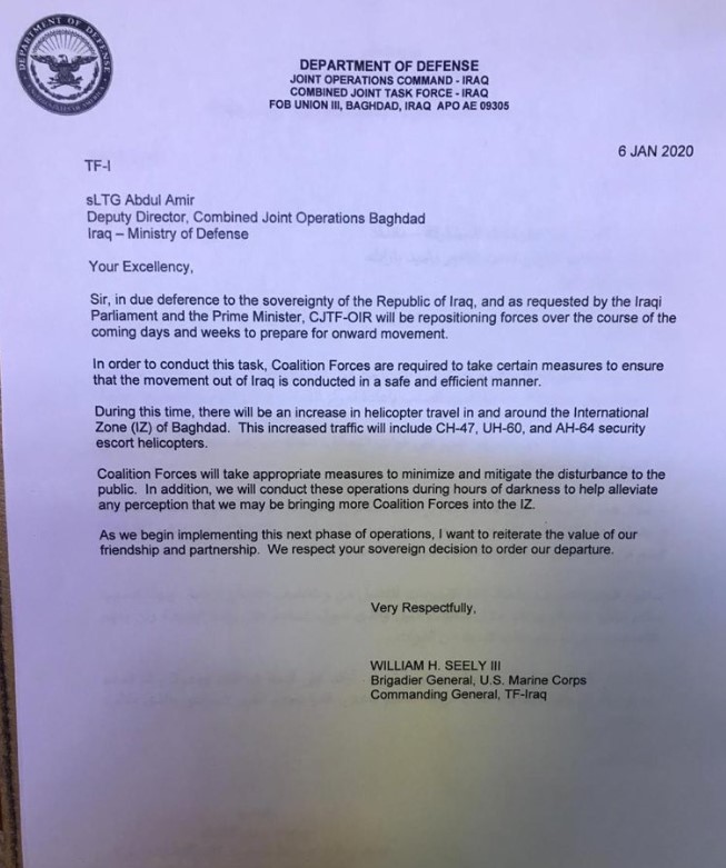 Parlamenti i Irakut votoi pak ditë më parë pro kërkesës për të larguar trupat amerikane nga vendi pas vrasjes së gjeneralit iranian, Kasem Sulejmani. Por pavarësisht vendimit të Parlamentit, presidenti amerikan, Donald Trump, kërcënoi Irakun me sanksioneve të ashpra, nëse dëbohen ushtarët amerikanë.