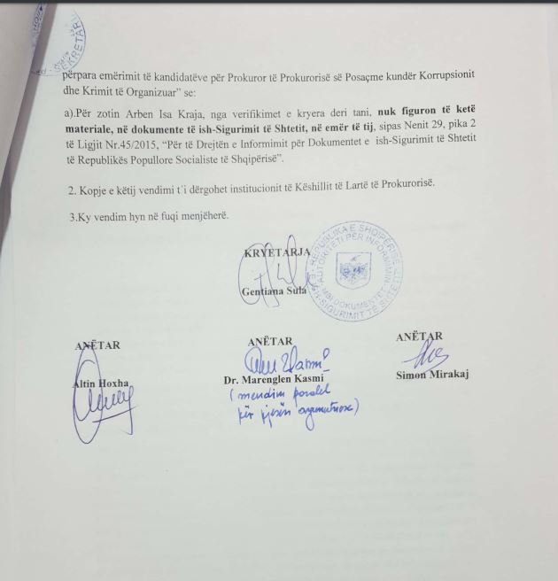 “Nga verifikimet e kryerea deri tani, rezulton se, shtetasi Arben Isa Kraja, ka qenë me detyrë në Hetuesinë e Rrethit Shkodër në vitin 1990, pra përpara datës 2 korrik të vitit 1991, që është edhe fushëveprimi i ligjit mbi bazën e të cilit vepron autoriteti.