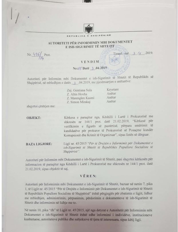 “Nga verifikimet e kryerea deri tani, rezulton se, shtetasi Arben Isa Kraja, ka qenë me detyrë në Hetuesinë e Rrethit Shkodër në vitin 1990, pra përpara datës 2 korrik të vitit 1991, që është edhe fushëveprimi i ligjit mbi bazën e të cilit vepron autoriteti.