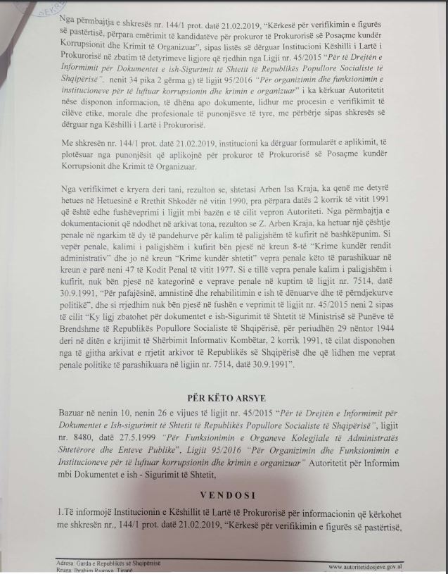 “Për zotin Arben Isa Kraja, nga verifikimet e kryerea deri më tani, nuk figuron të ketë materiale, në dokumente të ish-Sigurimit të Shtetit, në emër të tij, sipas nenit 29, pika 2 të Ligjit Nr.45/2015, “Për të Drejtën e Informimit për Dokumentet e ish-Sigurimit të Shtetit të Republikës Popullore Socialiste të Shqipërisë”.