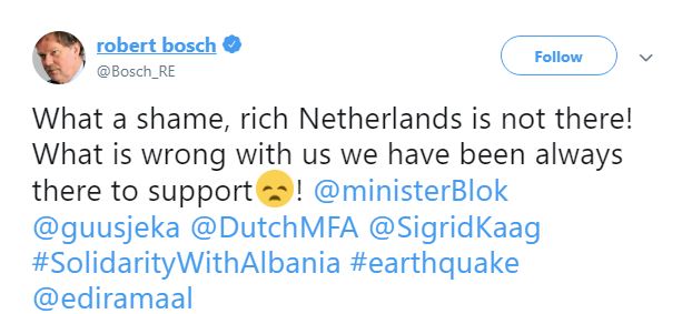 Mes listës së shteteve nuk ishte Holanda dhe Bosch këtë e konsideroi një turp. Çfarë turpi, Holanda e pasur nuk është aty! Çfarë po shkon keq me ne, kemi qenë gjithmonë aty për të ndihmuar,”-shkroi ai në Twitter.