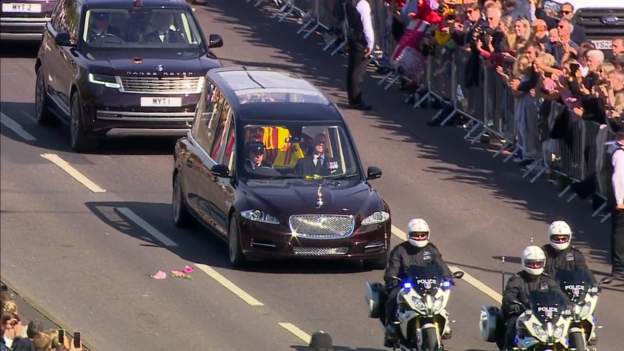 Anëtarët e publikut janë mbledhur me mijëra përgjatë rrugës që po kalon procesioni funeral i Mbretëreshës për në Windsor.