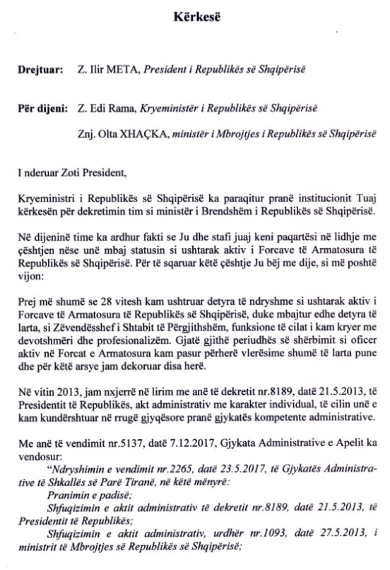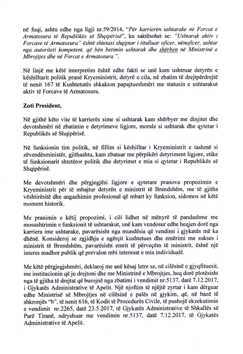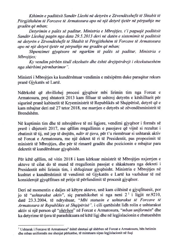 Me pranimin e këtij propozimi, i cili lidhet në mënyrë të pandashme me mos ushtrimin e funksionit të ushtarakut, unë kam vendosur edhe heqjen dorë nga karriera ime ushtarake, pavarësisht nga mundësia që vendimi i Gjykatës më ka dhënë. Konsideroj se zgjidhja e ngërçit kushtetues dhe emërimi me sukses i ministrit të Brendshëm, pavarësisht emrit të përveçëm të ministrit, është një interes madhor publik që prevalon mbi interesat e mia individuale.”, shkruan Lleshi