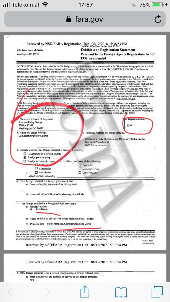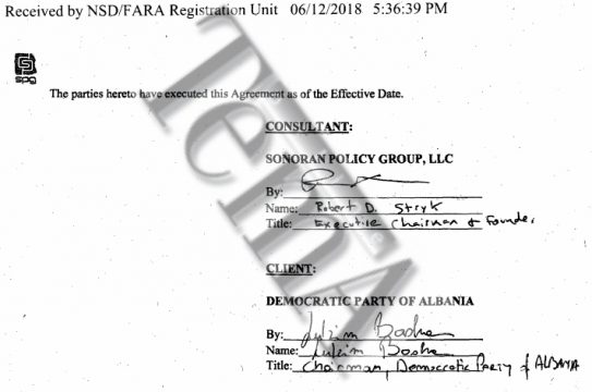 Departamenti i Drejtësisë në SHBA ka publikuar faksimilet e marrëveshjes së fundit të Partisë Demokratike me kompaninë amerikane të lobimit “Sonoran Policy Group, LLC”.