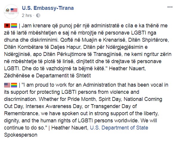 Ambasada e SHBA në vendin tonë ka postuar në Facebook, citimin e një zëdhënësje të Departamentit Amerikan të Shtetit, Heather Nauert.