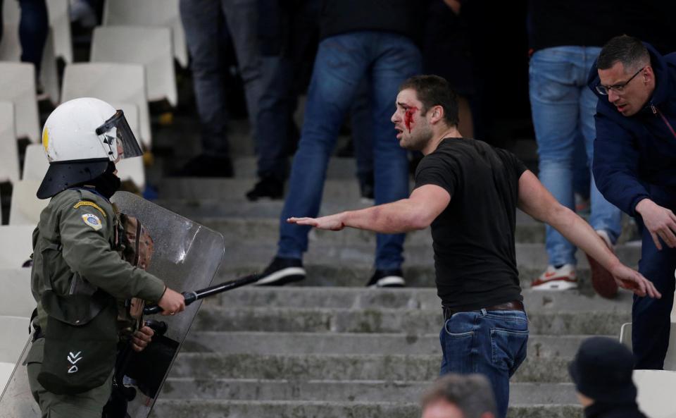Një foto shokuese dëshmon një tifoz të Ajax që reagon ndaj oficerëve të policisë teksa shfaqet me fytyrë të gjakosur si rezultat i dhunës së pësuar.