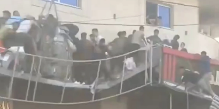 Një ballkon i një pallati në Gaza City u shemb ndërsa dhjetëra palestinezë u përpoqën të merrnin produkte nga një pako me ndihma humanitare që kishte rënë në çatinë e një restoranti.