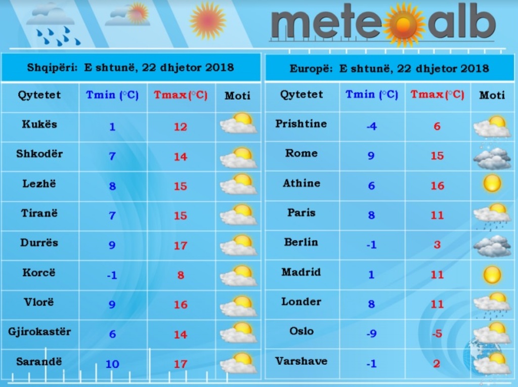 Sipas MeteoAlb, temperaturat e ajrit ulen në mëngjes por mesdita sjellë rritje të lehtë të tyre duke luhatur vlerat ditore nga -3 °C në deri në 17 °C.