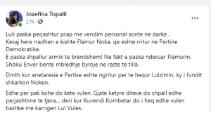 Ish nënkryetarja e PD Jozefina Topalli ka reaguar sërish sot ndaj vendimit të Luzlim Bashës për të shkarkuar Flamur Nokën nga nënkryetar i komisionit parlamentar të Sigurisë.