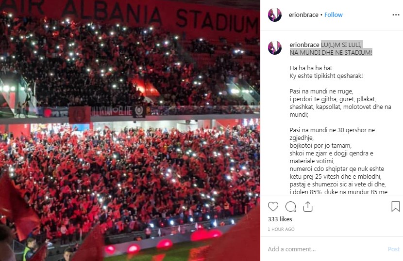 Zëvendëskryeministri Erion Braçe ka reaguar një ditë pas ndeshjes Shqipëri Francë në stadiumin ‘Air Albania’, ku disa të ‘tifozë’ thirrën në kor “Rama Ik”.