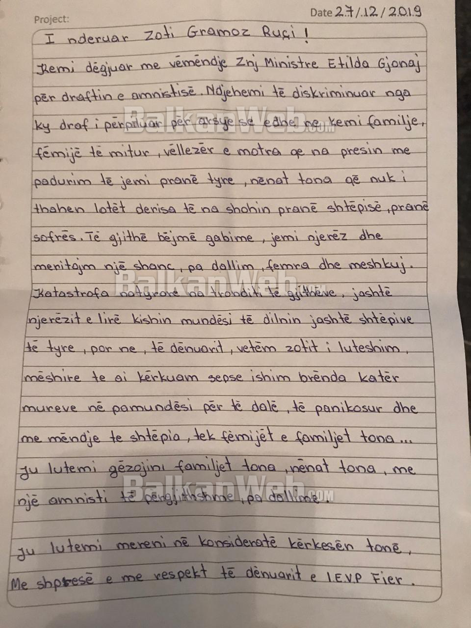 “Ndjehemi të diskriminuar nga ky draft i përpiluar për arsye se edhe ne kemi familje, fëmijë të mitur, vëllezër e motra që na presin me padurim të jemi pranë tyre, nënat tona që nuk i thahen lotët derisa të na shohin pranë shtëpisë, pranë sofrës. Të gjithë bëjmë gabime, jemi njerëz dhe meritojmë një shans, pa dallim, femra dhe meshkuj”, shkruhet ndër të tjera në letrën e tyre ku përmendet edhe tërmeti i 26 nëntorit që tronditi shqiptarët. (BW)