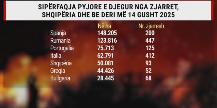Shqipëria është vendi i parë në Rajon dhe Evropë për hapësirën me pyje e shkurre të djegur këtë vit në raport me totalin e sipërfaqes. Nga 28 mijë e 748 km2 territor, vendi ka humbur mbi 50 mijë hektarë si pasojë e zjarreve këtë vit, shifër kjo sa 1.9 për qind e totalit. Të dhënat nga Sistemi Evropian i Informacionit për Zjarret në Pyje tregojnë se sipërfaqja e shkrumbuar deri më tani si pasojë e 93 zjarreve në pyje e kullota është më e madhja ndonjëherë.