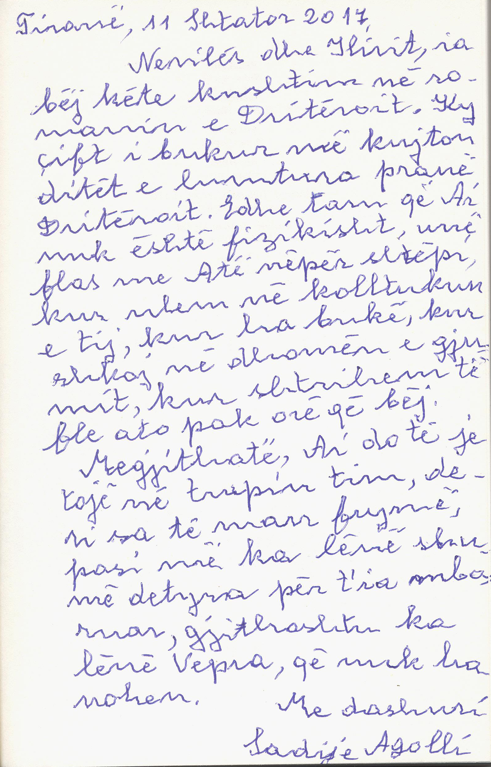 Do mbetet një nga pengjet e mëdha të jetës time që nuk munda të isha i pranishëm në përcjelljen e saj, në udhën drejt Amëshimit! Një arsye përtej pamundësive të mija më pengoi për të mos qenë i pranishëm ditën e Lamtumirës për Gruan Fisnike, e cila me mirësinë, dashurinë dhe dhimbjen e bukur të saj, e fisnikëroi edhe më shumë Dritëroin tonë, miqtë dhe të gjithë njerëzinë, anembanë Shqipërisë. Në faqen e brendëshme të kopertinës në romanit e Dritëroit “Trëndafil në gotë” të cilin na e dhuroi kohët e fundit, Sadija shkruan: “Nevilës dhe Ilirit, ia bëj këtë kushtim në romanin e Dritëroit. Ky çift i bukur më kujton ditët e lumtura pranë Dritëroit. Edhe tani që Ai nuk është fizikisht, unë flas me Atë nëpër shtëpi, kur ulem në kolltukun e Tij, kur ha bukë, kur shkoj në dhomën e gjumit, kur shtrihem të fle ato pak orë që bëj. Megjithatë, Ai do të jetoj në trupin tim, derisa të marrë frymë, pasi më ka lënë shumë detyra për t’ia mbaruar, gjithashtu ka lënë vepra, që nuk harrohen. Me dashuri, Sadije Agolli – Tiranë, 11 Shtator, 2017”. Ky kushtim, është një prej disa nga kujtimet që ne si familje kemi nga miqësia jonë mbi 30 vjeçare me të pavdekshmit Dritëro dhe Sadije Agolli. Dy javë, para se ajo të niste rrugëtimin e saj pa kthim, biseduam gjatë në telefon.