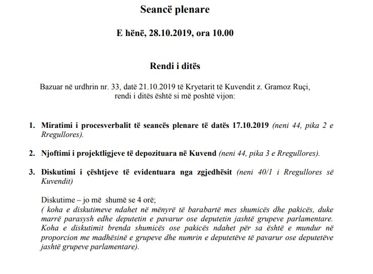 Të enjten e kaluar nuk pati seanca, pasi me ndryshimet e reja në rregulloren e Kuvendit të Shqipërisë është përcaktuar që deputetët një herë në muaj të jenë në zonat e tyre ku janë zgjedhur dhe më pas të mbahet një seancë plenare për t’i diskutuar.