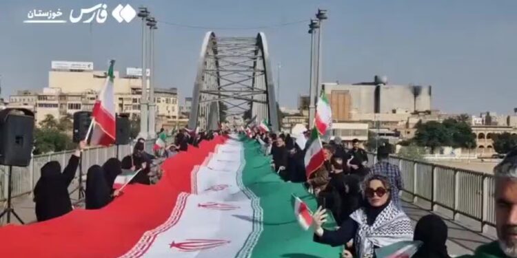 Pamje të publikuara nga mediat iraniane tregojnë qindra njerëz, kryesisht gra dhe fëmijë, të cilët kanë krijuar një zinxhirë njerëzor mbi një urë në qytetin jugperëndimor të Ahvazit.