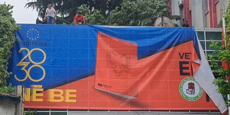 Posteri i cili ka shoqëruar fushatën e socialistëve, tashmë në përmasa të mëdha, ka ‘mbuluar’ godinën rozë.