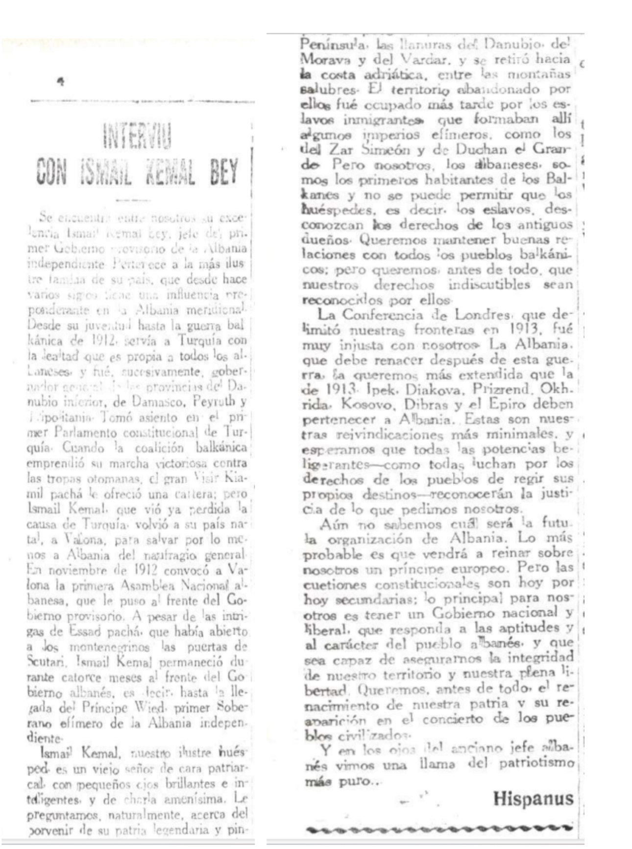 Gazeta spanjolle “El Dia” në Madrid, më 9 tetor 1918, ka botuar një intervistë me Ismail Qemal Vlorën. Ajo është realizuar nga gazetari spanjoll me pseudonimin “Hispanus” dhe është intervista e fundit e Ismail Qemalit për mediat ndërkombëtare. Intervista është zhvilluar përgjatë periudhës kur ai jetoi në Spanjë dhe publikohet për herë të parë në Shqipëri. Vetëm pak muaj më pas Ismail Qemali do të mbyllte sytë në Peruxhia.