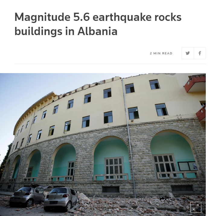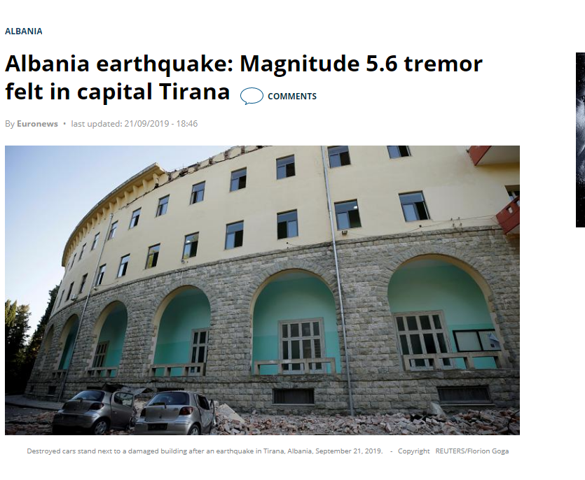 Nuk ka raportime për viktima, por një ndërtesë apartamentesh në qytetin bregdetar të Durrësit u raportua të ishte dëmtuar keq. Fotografitë e shpërndara në Twitter treguan shkatërrim në ndërtesën e universitetit të Tiranës”, shkruan Euronews.