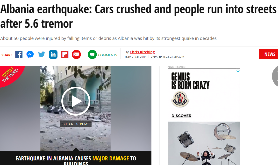 Ministria e Mbrojtjes tha se ishte tërmeti më i fuqishëm në Shqipëri në 30 vitet e fundit. Banorët në Tiranë u larguan nga ndërtesat dhe dolën në rrugë dhe në parqe për siguri”, shkruan Reuters.