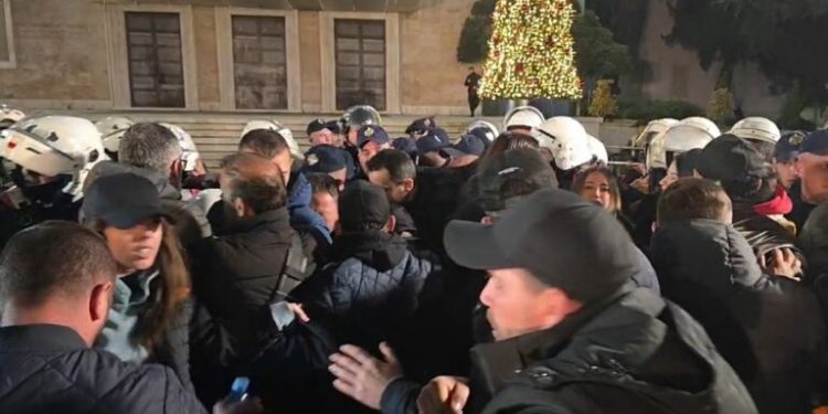 Protestuesit janë përplasur me kordonin e sigurisë ndërsa kanë tentuar të thyejnë edhe gardhin metalik.