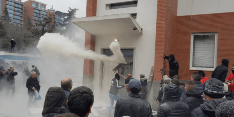 Selia e Partisë Demokratike u sulmua gjatë ditës së 8 janarit nga mbështetës të ish kryeministrit Sali Berisha, të cilët iu përgjigjen thirrjes së tij për marrjen nën kontroll të godinës ku po qëndronte kryetari demokrat Lulzim Basha dhe drejtues të tjerë të partisë.Fillimisht dera kryesore e selisë u hap me forcë, përpara orës 12.00 e cila ishte ora në të cilën ishte thirrur protesta. Xhamat e saj u thyen por protestuesit u ndalën në pjesën e hollit, ku mesa duket u gjenden përpara dyerve të tjera të përforcuara me veshje hekuri. Pas këtij momenti nuk ka patur asnjë cast qetësie. Mbështetësit e ishkryeministrit Berisha provuan të hyjnë nga drejtime të ndryshme. Një tentativë e disa personave që me anë të shkallëve u ngjitën në katin e dytë, në një ballkon në krahun e majtë, u zmbraps, nga disa persona nga brenda godinës. Një prej protestuesve mbeti i plagosur në kokë. Përpjekjet e tjera po ashtu janë zmbrapsur, ndërsa nga brenda selisë po përdorej gaz lotsjellës. Situata në selinë e Partisë Demokratike u qetësua pasi policia ndërhyri me kërkesë të deputetëve që ndodheshin brenda saj të cilët kishin deklaruar se ndjeheshin të kërcënuar nga sulmi i dhunshëm i mbështetësve të ish kryeministrit Sali Berisha. Njësitë speciale morën kontrollin e godinës. Oborri dhe e gjithë zona përreth u boshatis, pas përdorimit të gazit lotsjellës.