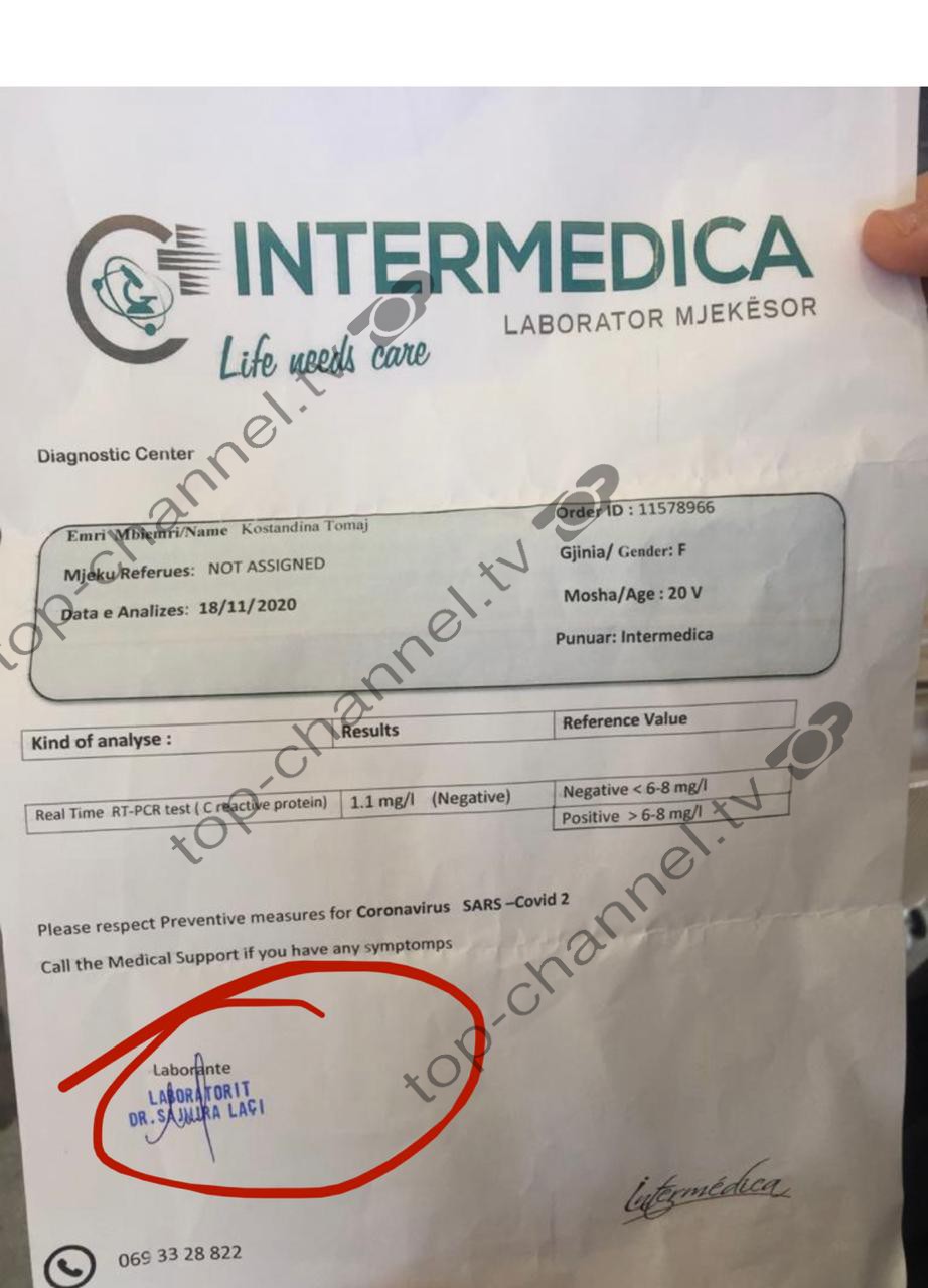 Kujtojmë se së fundmi në doganën e Kakavijës u regjistrua një ngjarje e paprecedentë, ku një 20-vjeçare është kapur me testin e falsifikuar të covid-19. Top Channel mëson se e reja quhet Kostandina Tomaj, ndërkohë që në fletën e printuar prej saj ishte edhe logoja e një laboratori privat i licensuar për kryerjen e tamponëve por që nuk ka lidhje me veprimin e paligjshëm të kryer nga 20-vjeçarja.