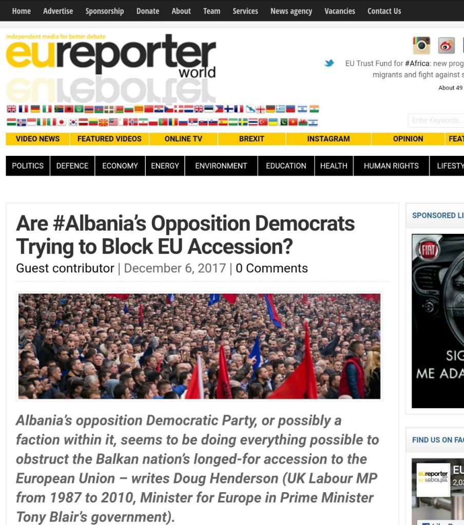 “Partia Demokratike e opozitës shqiptare, ose ndoshta një fraksion brenda saj, duket se po bën gjithçka që është e mundur për të penguar anëtarësimin e dëshiruar të vendit ballkanik në Bashkimin Europian”, shkruan në www.eureporter.co me qendër në Bruksel, Doug Henderson, ish- deputet laburist në Mbretërinë e Bashkuar nga 1987 në 2010, ministër për Europën në qeverinë e kryeministrit Tony Blair.