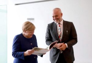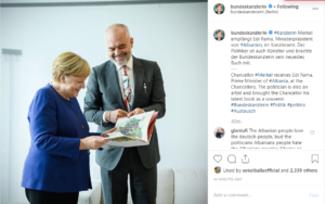 “Kancelarja Merkel priti në Kancelari Edi Ramën, Kryeministrin e Shqipërisë. Politikani është gjithashtu një artist dhe i solli Kancelares librin e tij të fundit si dhuratë”, shkruan Merkel.