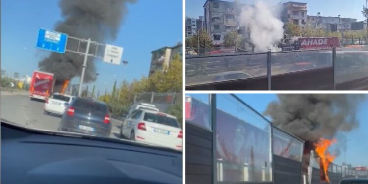 Një kamion që ka qenë në lëvizje e sipër është përfshirë nga flakët. Ngjarja ka ndodhur në Unazë të Re në Tiranë.
