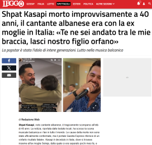 Tgcom24: Muzikë: Këngëtari i njohur shqiptar Shpat Kasapi vdes në moshën 40 vjeç | Ish-gruaja e tij: “Më ike në krahët e mi.”