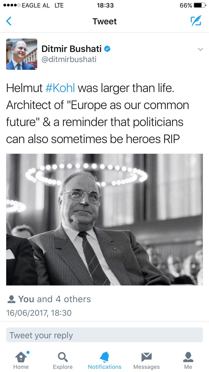 Ministri i Jashtëm Ditmir Bushati ka shpërndarë një mesazh ngushëllimi në Twitter për ndarjen nga jeta të ish-kancelarit gjerman Helmut Kohl.