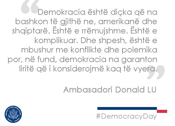 “DEMOKRACIA ËSHTË DIÇKA QË NA BASHKON TË GJITHË NE, AMERIKANË DHE SHQIPTARË. ËSHTË E RRËMUJSHME. ËSHTË E KOMPLIKUAR. DHE SHPESH ËSHTË E MBUSHUR ME KONFLIKTE DHE POLEMIKA, POR NË FUND DEMOKRACIA NA GARANTON, LIRITË QË I KONSIDEROJMË KAQ TË VYERA”, shkruan Donald Lu.