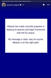 Brunner përmes një postimi në rrjetet sociale është shprehur se vendi ynë është në rrugën e duhur teksa thekson se është bërë përparim konkret lidhur me politikat e BE-së.