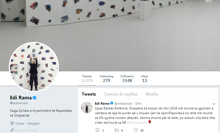 “Sipas Bankës Botërore, Shqipëria ka krijuar në vitin 2018 më shumë se gjysmën e vendeve të reja të punës që u krijuan vjet në rajon!Papunësia ka rënë më shumë se 6% qyshse morëm detyrën. Akoma shumë për të bërë, po askush s’ka bërë dhe s’bën dot kurrë sa NE #KrenarpërPS