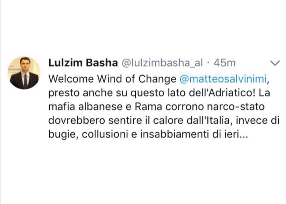Ish deputetja e PD Majlinda Bregu ka ironizuar me postimin e kryetarit të PD Lulzim Basha, i cili rreth një orë më parë shkruajti një mesazh në twitter për ministrin e Brendshëm italian Mateo Salvini, ku pasi paralajmëronte erën e ndryshimeve që ky i fundit po sjell i kërkonte Salvinit që këtë erë ndryshimesh ta sjell dhe në Shqipëri kunder qeverise. Bregu ironizon me Bashën duke nënvizuar se vërtetë fitorja ose humbja vijnë nga jashtë, por më parë Basha duhet të gjejë drejtimin e erës.