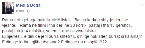 Me anë të një statusi në Facebook, Doda shkruan të dy liderat po sillen si kalamaj ku në të vërtetë duhet të tregojnë se janë burra shteti.
